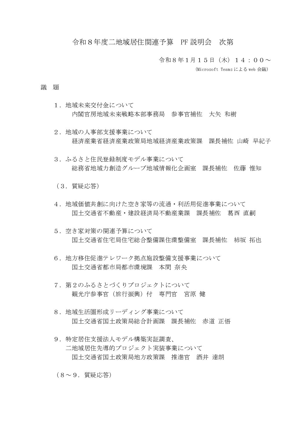 会員のみなさまに各省庁から二地域居住施策推進を支援する国の予算・制度等について説明を行う「令和8年度 二地域居住関連予算 PF説明会」が1月15日(木)14:00~16:00 に開催されました。当日の資料につきましては下記よりダウンロード頂けます。(要会員ログイン)