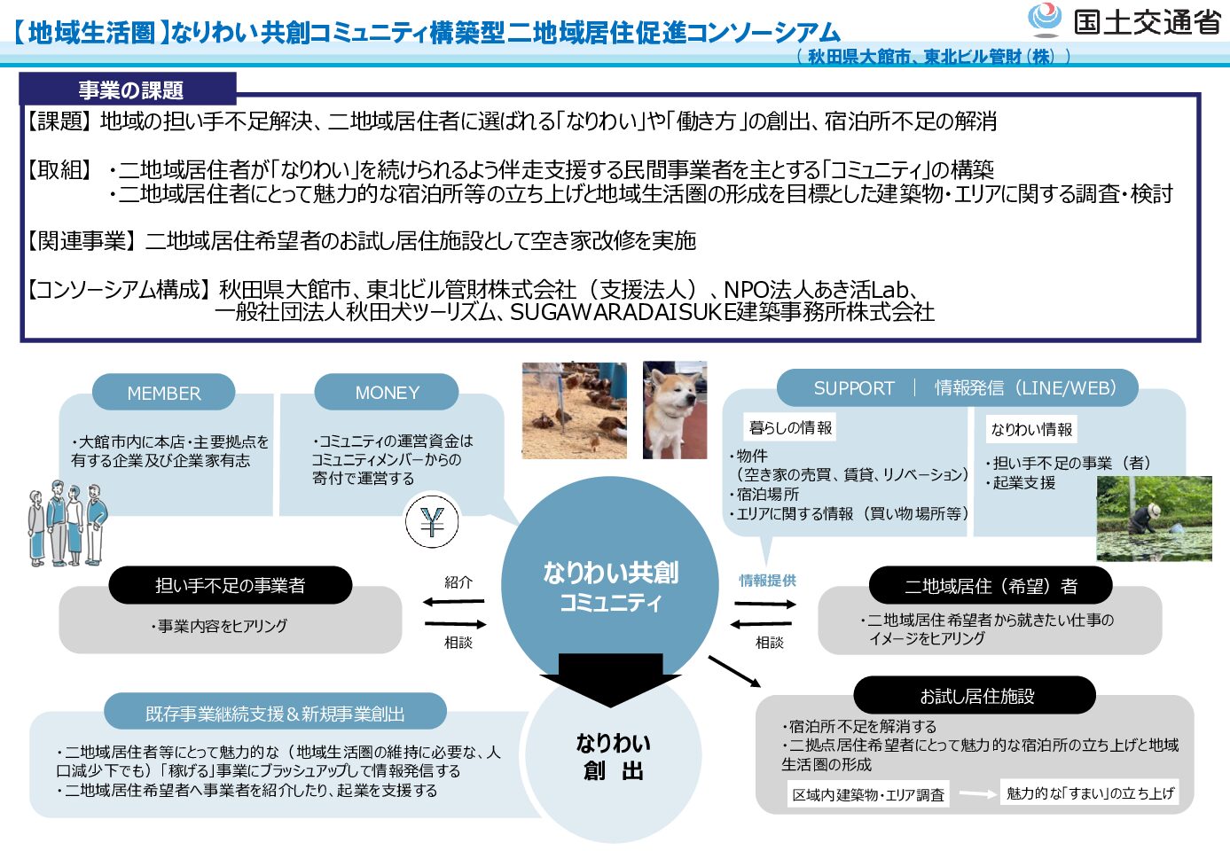 これらの課題に対し、大館市は、民間事業者や地域団体と連携し、二地域居住者が地域と関わりながら「なりわい」を継続できる仕組みを構築するため、「なりわい共創コミュニティ構築型 二地域居住促進コンソーシアム」を立ち上げました。