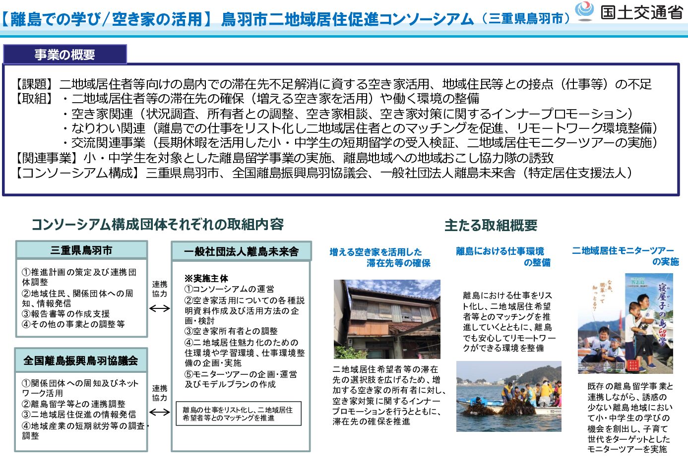 こうした課題に対応するため、鳥羽市は、空き家活用と「離島での学び・仕事・交流」を一体的に進める二地域居住促進コンソーシアムを組成しました。