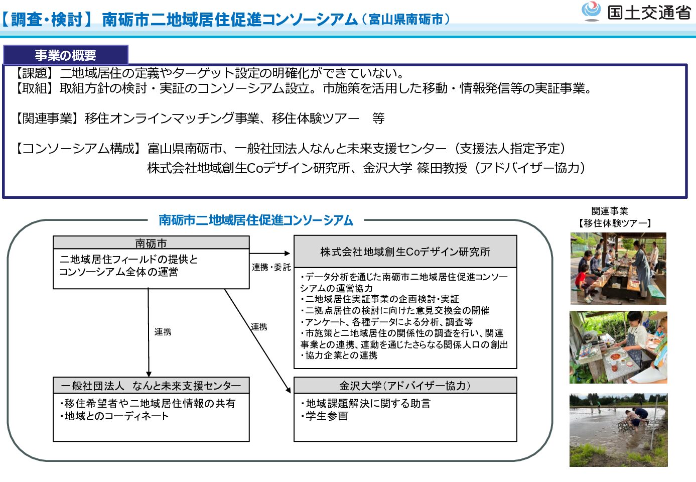 本事業は、南砺市、一般社団法人なんと未来支援センター、株式会社地域創生Coデザイン研究所、金沢大学(アドバイザー協力)によるコンソーシアム体制で推進しています。