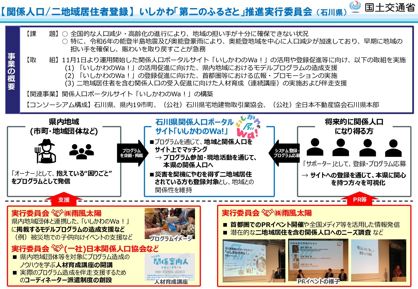 本事業は、石川県および県内19市町を中心に、公益社団法人石川県宅地建物取引業協会、公益社団法人全日本不動産協会石川県本部などが参画する体制で推進されています。実行委員会には株式会社雨風太陽や一般社団法人日本関係人口協会等が関わり、モデルプログラムの造成支援や人材育成、広報・PRの役割を担っています。行政と民間が役割分担しながら、県内全域での関係人口創出を支える体制が構築されています。