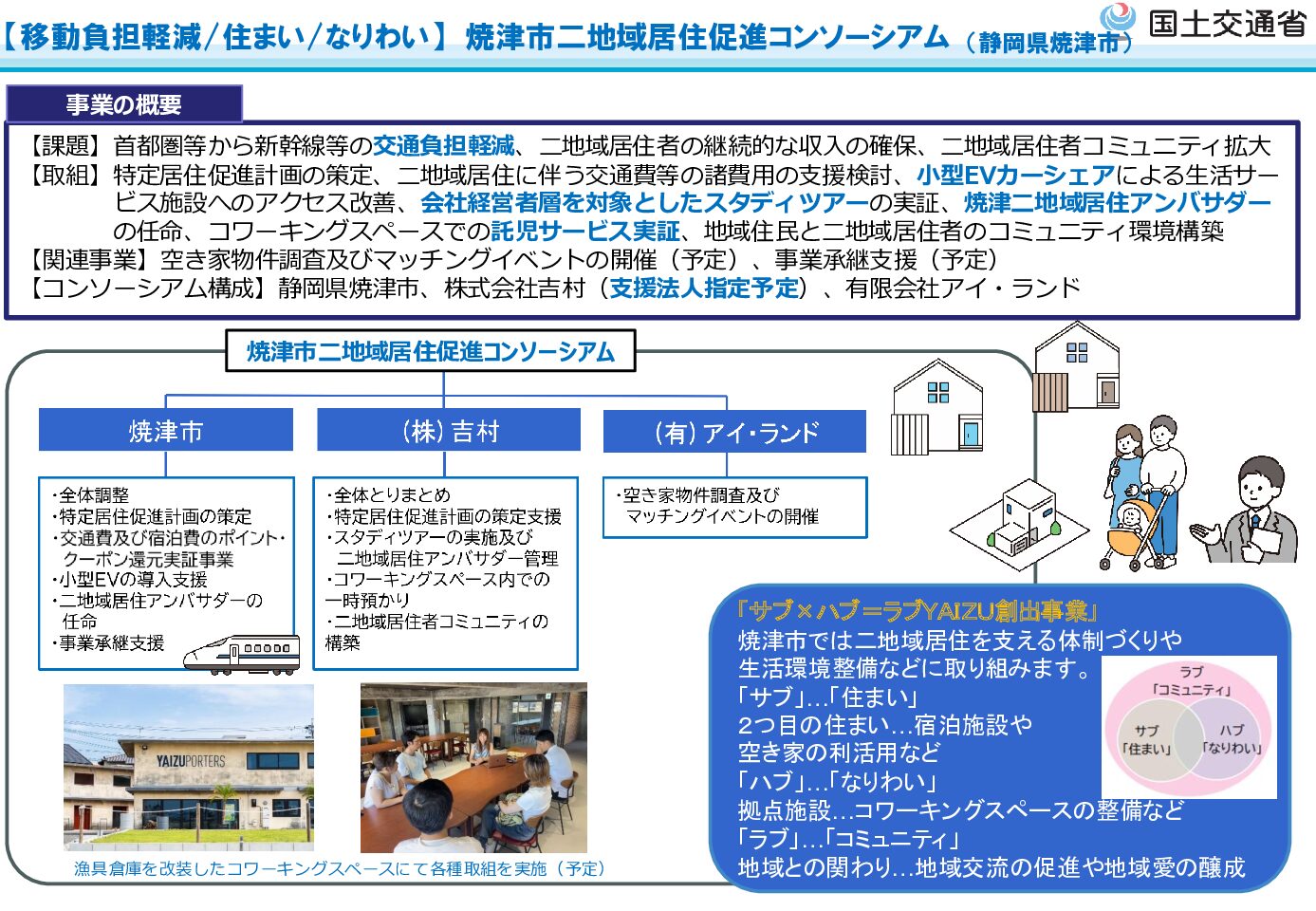 焼津市では、首都圏などからの二地域居住を進めるにあたり、交通費負担の軽減や継続的な収入確保、二地域居住者同士や地域とのつながりづくりが課題とされています。 本事業では、移動・住まい・なりわいを一体的に捉え、二地域居住を支える仕組みや受入環境の整理と実証に取り組んでいます。