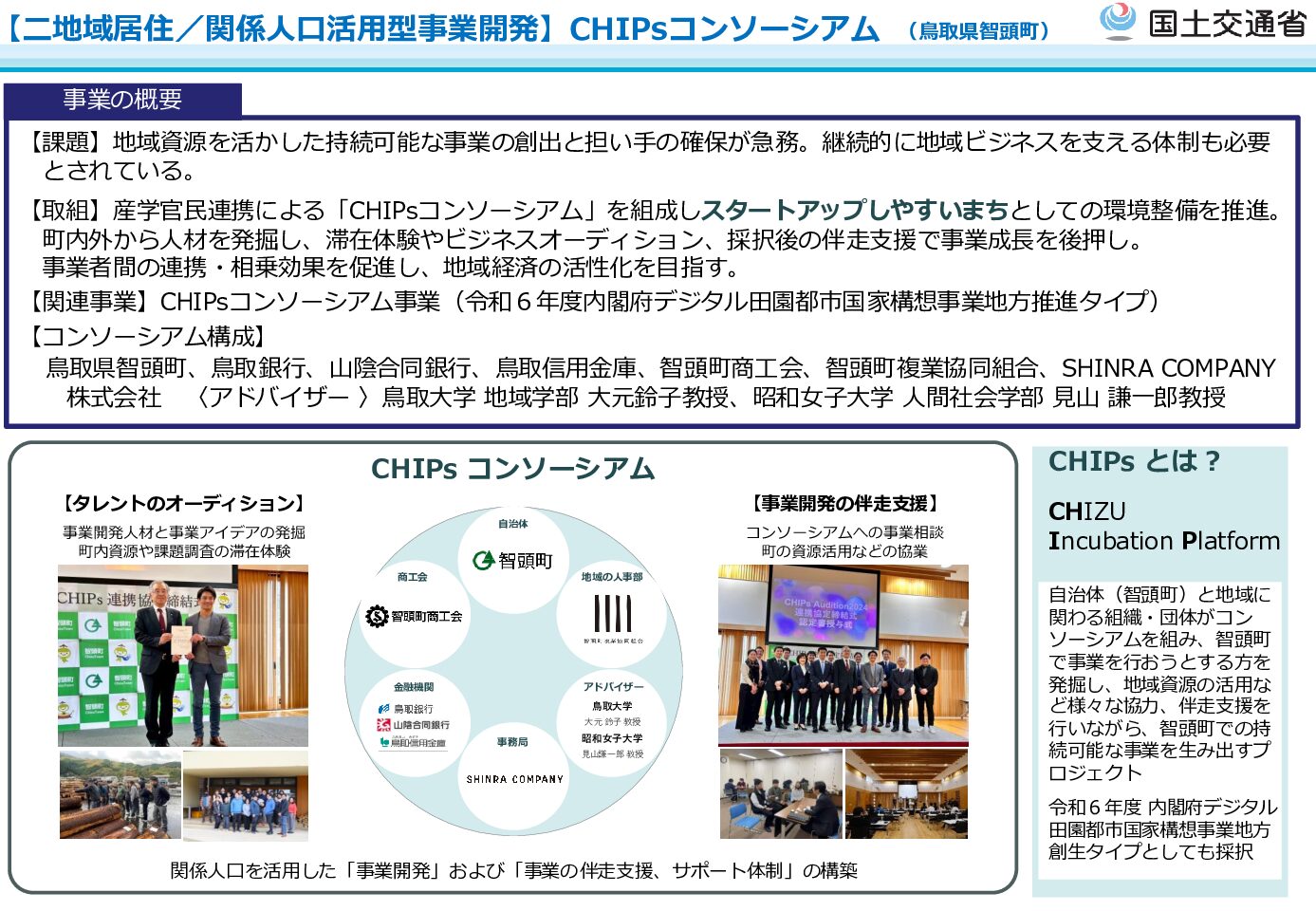 本事業は、鳥取県智頭町を中心に、金融機関、商工団体、複業協同組合、民間企業、大学関係者などが参画するコンソーシアム体制で推進されています。自治体、金融機関、商工会、大学、事業者がそれぞれの役割を担い、関係人口を活用した事業開発と伴走支援を一体的に進めています。