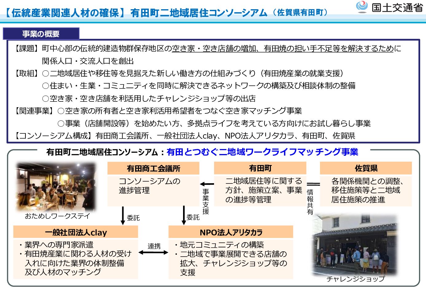 有田町では、町中心部の伝統的建造物群保存地区を中心に、空き家・空き店舗の増加や有田焼産業の担い手不足が課題となっていました。本事業では、二地域居住の考え方を取り入れながら、関係人口・交流人口の創出を通じて、住まい・仕事・地域との関わりを一体的に捉えた環境づくりを目指しています。