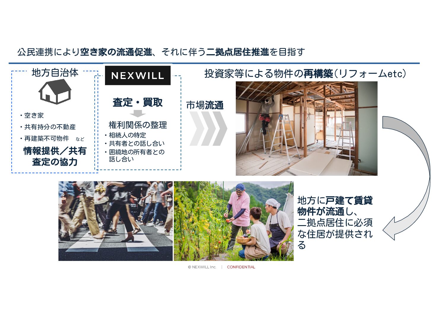 空き家所有者の「管理負担」「売却困難」「相続問題」等の課題を解消すると同時に、都市部在住者の「地方移住ニーズ」「多拠点生活志向」「テレワーク需要」といった社会的動向を結び付け、既存住宅ストックの循環を促進することを目的としております。