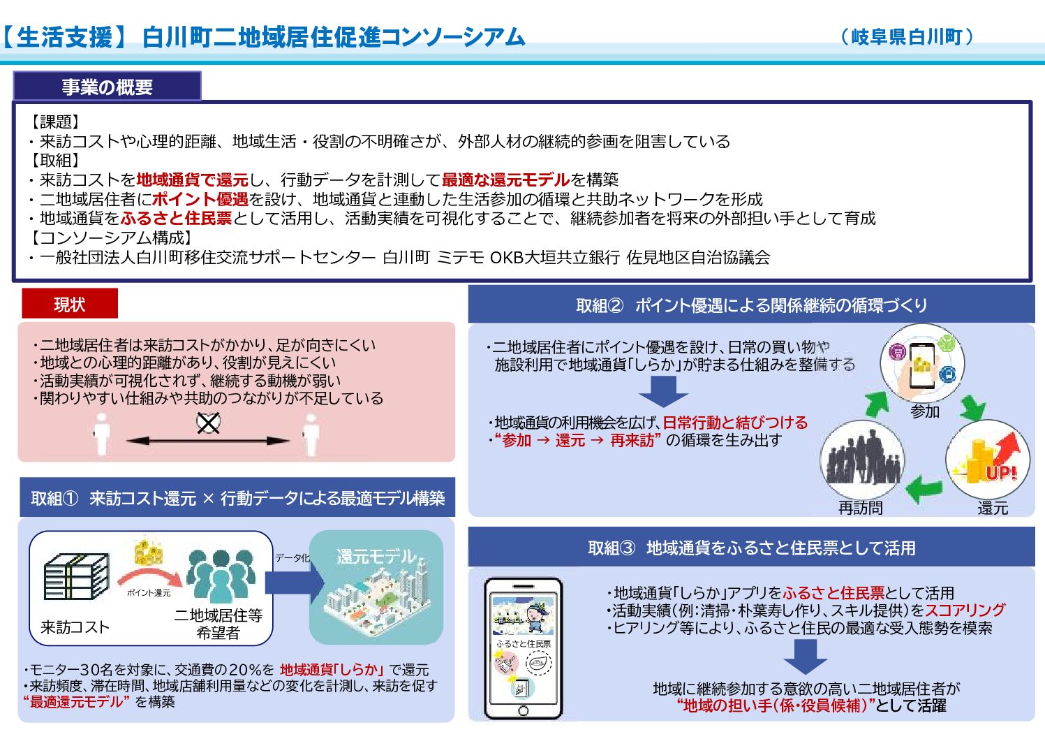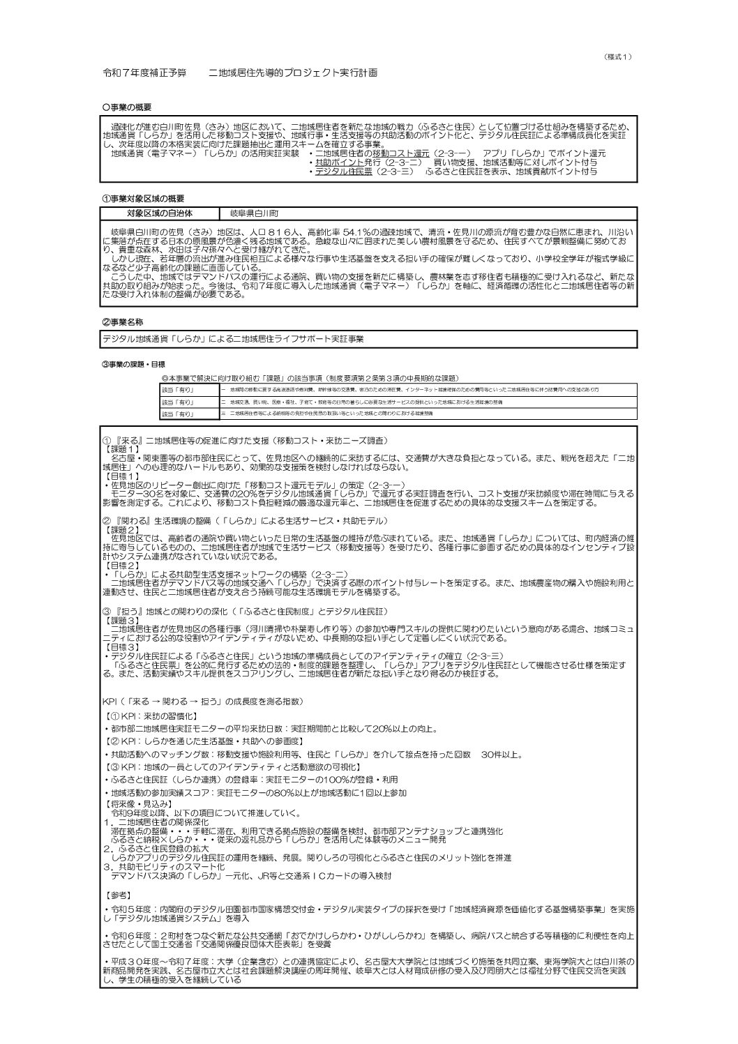 過疎化が進む白川町佐見(さみ)地区において、二地域居住者を新たな地域の戦力(ふるさと住民)として位置づける仕組みを構築するため、地域通貨「しらか」を活用した移動コスト支援や、地域行事・生活支援等の共助活動のポイント化と、デジタル住民証による準構成員化を実証し、次年度以降の本格実装に向けた課題抽出と運用スキームを確立する事業。