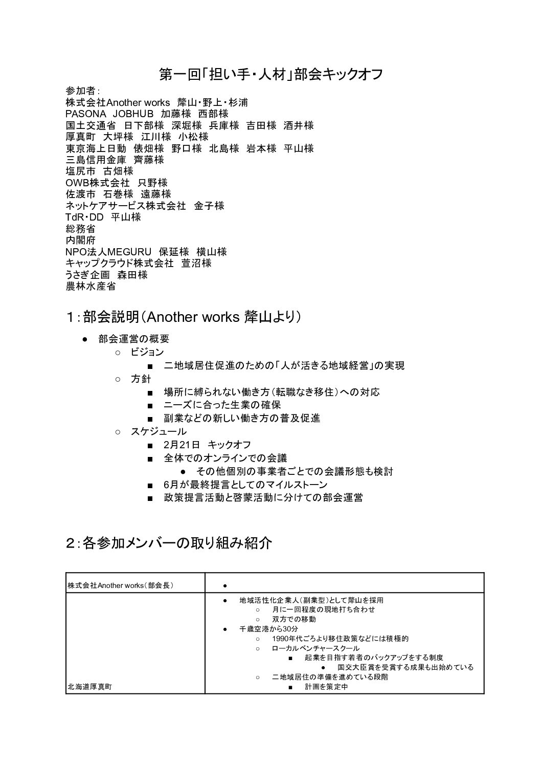 二地域居住の更なる促進に向けて、「中長期的な観点から検討すべき課題」への具体的な対応方策を検討するとともに、予算的・制度的な政策提言を目指して立ち上がった専門部会のうち、地域の担い手としての活用のあり方、企業・官公庁の人事制度のあり方等を議論・検討する「担い手・人材部会」の第1回目が開催されました。