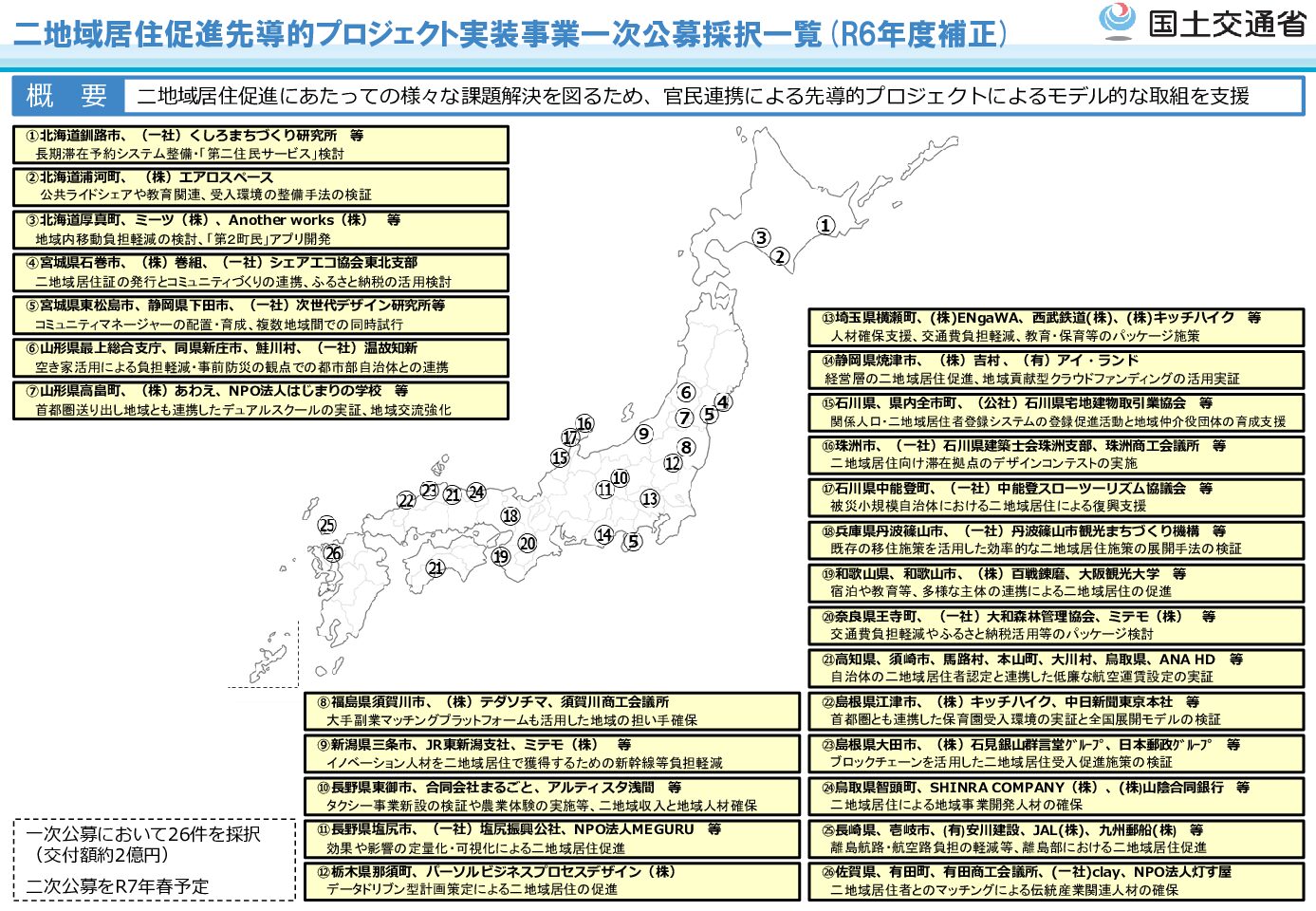 令和6年度「二地域居住先導的プロジェクト実装事業」として、国土交通省により、官民連携のコンソーシアムが実施する二地域居住等における中長期的な課題の解決に向けた先導的な取組26件が採択され、交付決定されました。 詳しくは、下記URLからご覧ください。