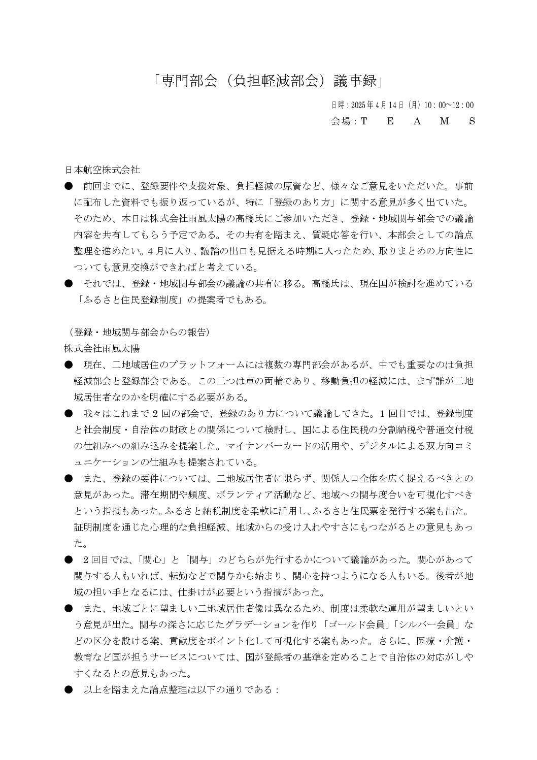 二地域居住の更なる促進に向けて、「中長期的な観点から検討すべき課題」への具体的な対応方策を検討するとともに、予算的・制度的な政策提言を目指して立ち上がった専門部会のうち、二地域居住等に伴う諸費用の負担軽減のあり方を議論・検討する「負担軽減部会」の第3回目が開催されました。