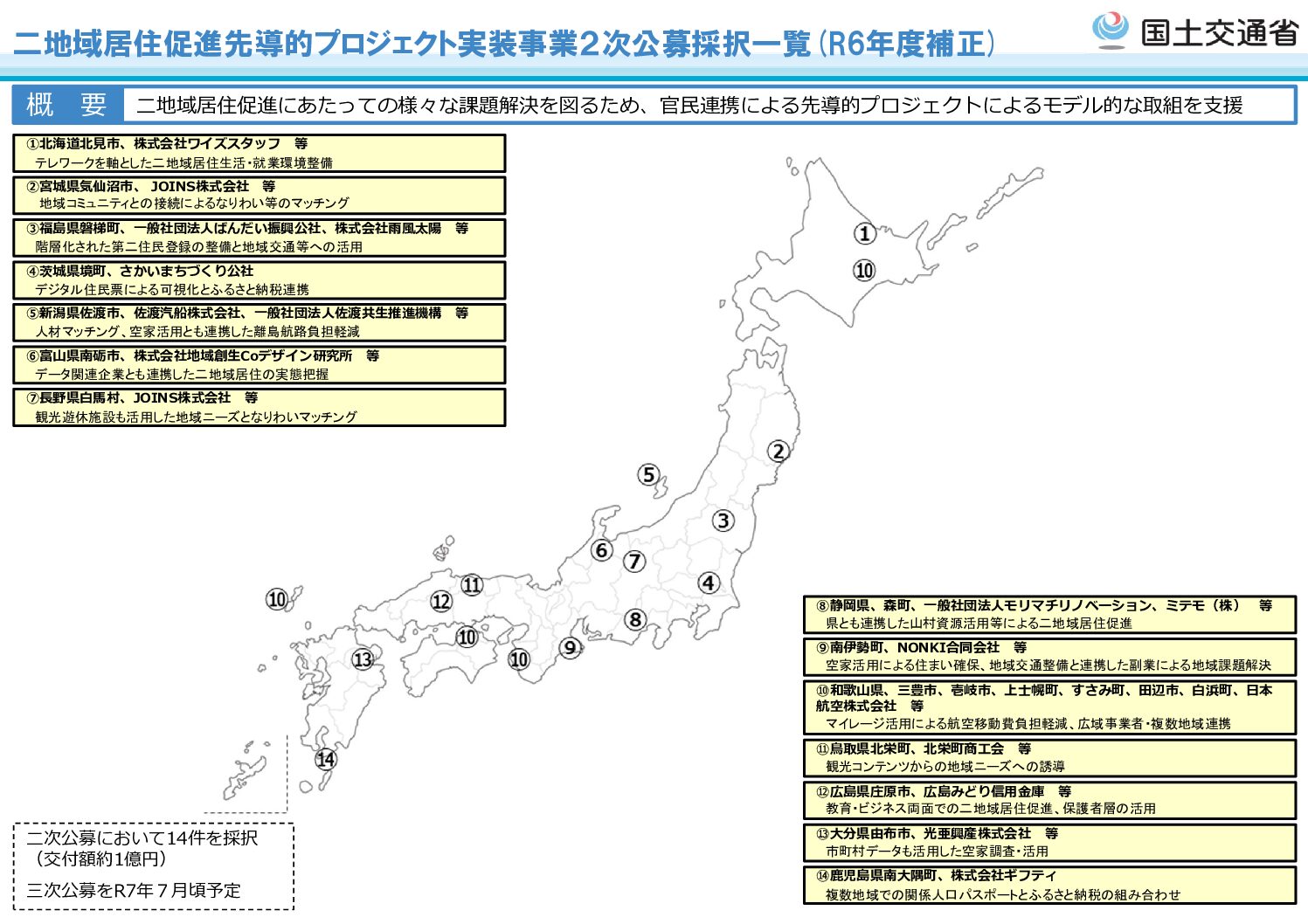 令和7年度「二地域居住先導的プロジェクト実装事業(2次公募)」として、国土交通省により、官民連携のコンソーシアムが実施する二地域居住等における中長期的な課題の解決に向けた先導的な取組14件が採択され、交付決定されました。 詳しくは、下記URLからご覧ください。