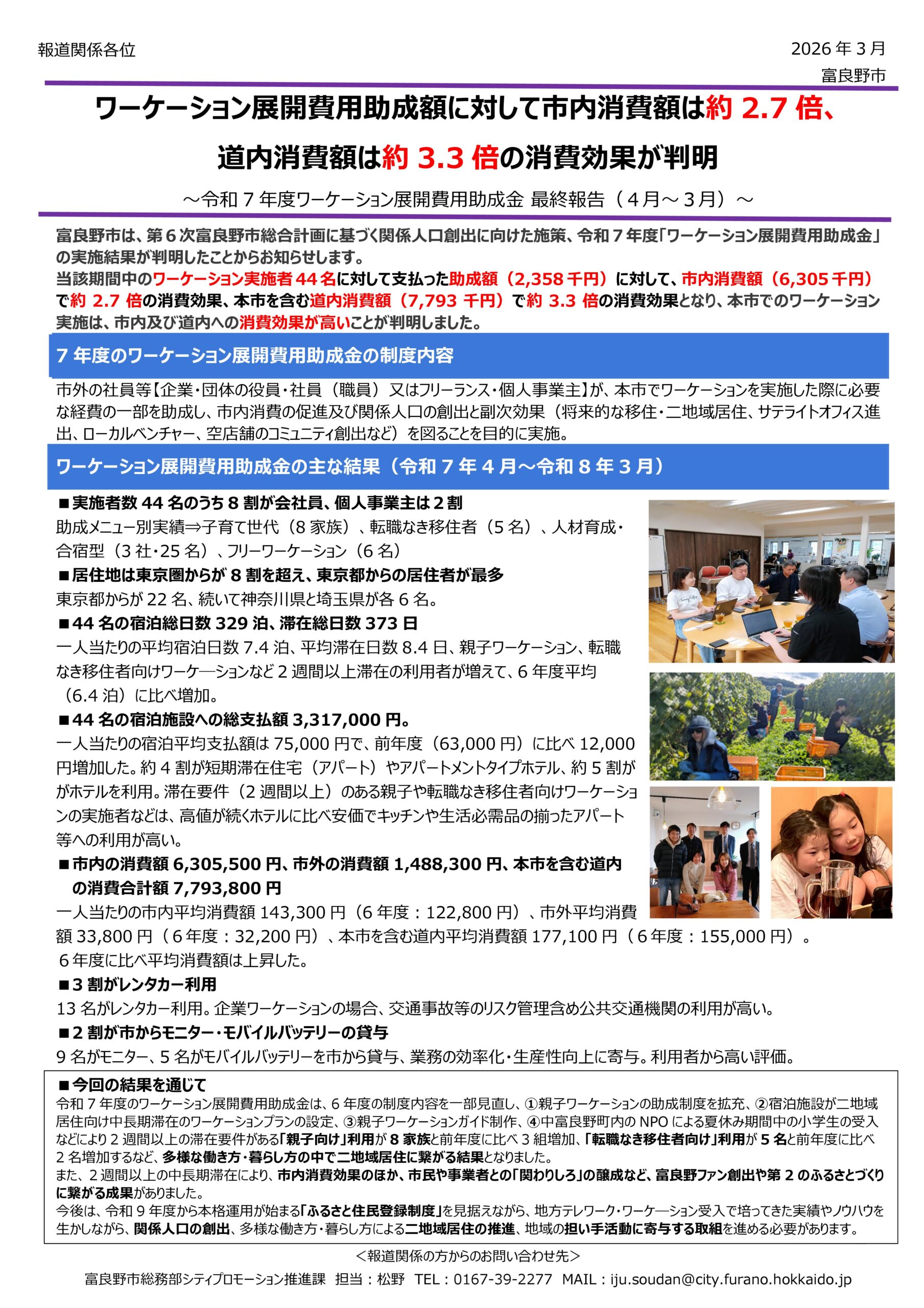 富良野市は、第6次富良野市総合計画に基づく関係人口創出に向けた施策、令和7年度「ワーケーション展開費用助成金」の実施結果が判明したことからお知らせします。当該期間中のワーケーション実証者44名に対して支払った助成額(2,358千円)に対して、市内消費額(6,305千円)で約2.7倍の消費効果、本市含む道内消費額(7,793千円)で約 3.3 倍の消費効果となり、本市での地方テレワーク・ワーケーション実施は市内及び道内への消費効果が高いことが判明しました。