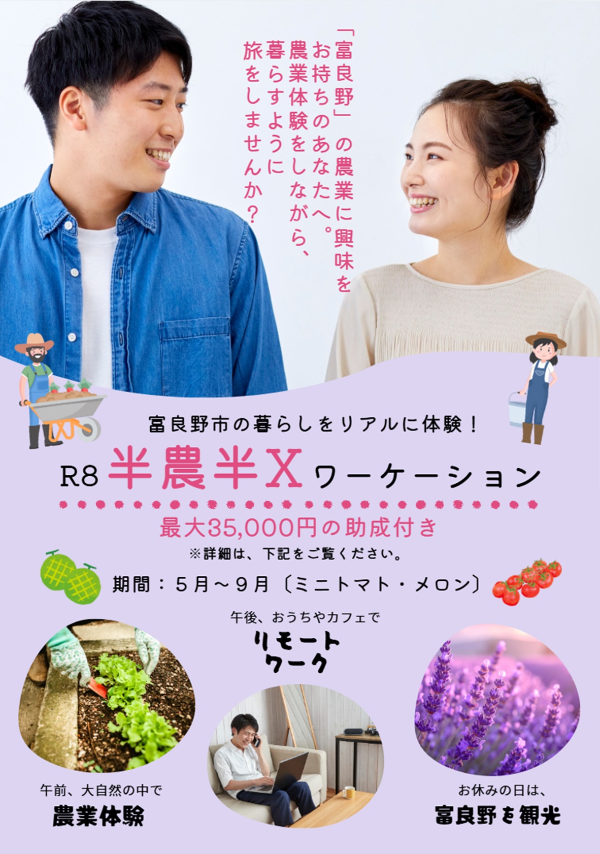 富良野市では5月~9月の期間、将来的な新規就農・雇用就農を考えている方、農業体験を希望される方を対象に、午前中は農作業、午後は個人ワークなど「半農半X」の暮らし方・働き方のワーケーションを体験した際に旅費の一部を助成します。富良野市の基幹産業である「農業」体験を通して、「農」のある暮らしや「アグリビジネス」「アグリテック」「フードビジネス」を考えるきっかけにしてみませんか?
